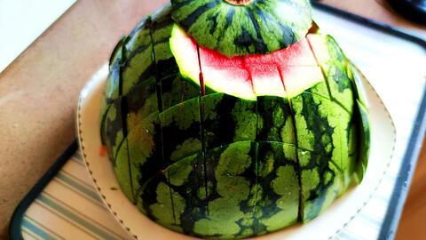 1. 刀工要准:切西瓜皮时,刀要垂直于西瓜皮,以免切得不均匀。